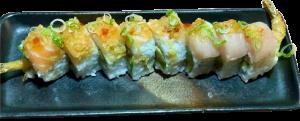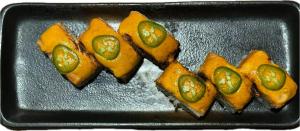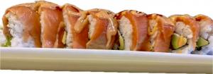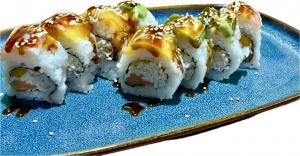 (salmon, crab meat & mango with avocado, mango, ebi. served with mango and unagi sauce)
