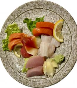 (3pcs salmon & 3pcs tuna sashimi, California roll, dynamite roll, 2pcs salmon, tuna, ebi sushi)
