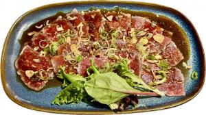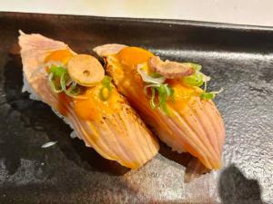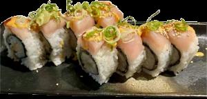 (tuna & salmon tempura roll wrapped with tuna. served with spicy sauce, garlic sesame & green onion)