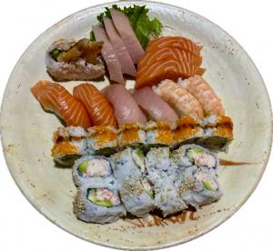 (3pcs of each salmon, tuna sashimi & 2pcs tako sashimi. 2pcs of each salmon, tuna, ebi & tamago sushi. California roll, spicy salmon roll, unagi paradise roll & avocado maki)